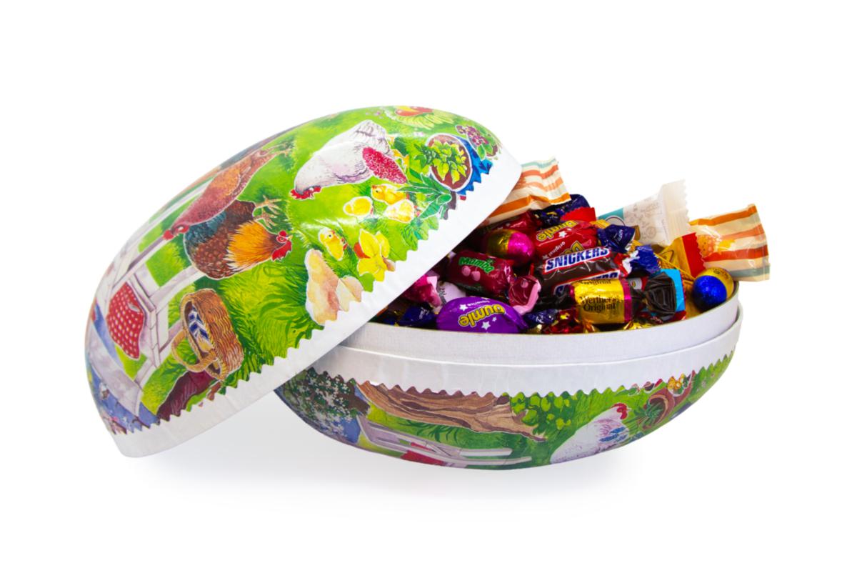 Påskägg med blandat inslaget varumärkesgodis. Lägg till kort för tydlig avsändare.