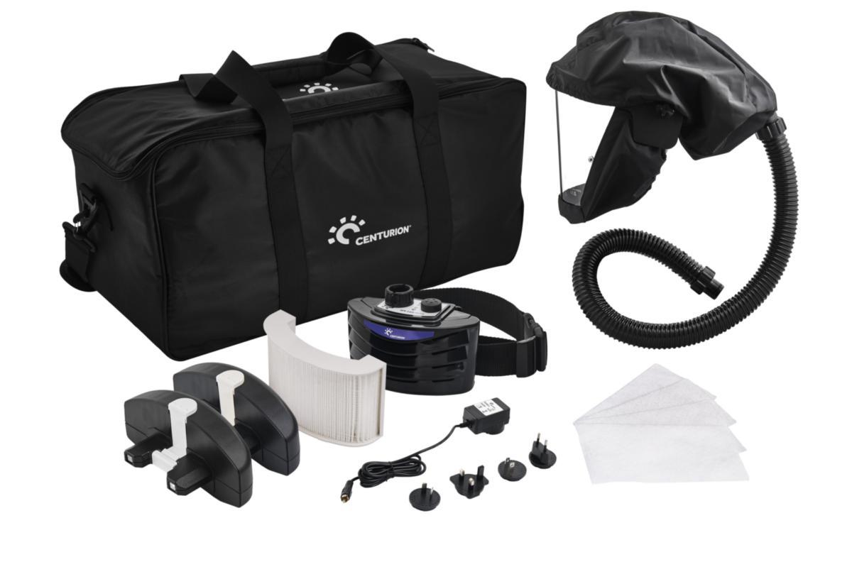 Komplett andningsskyddssystem med lättviktsvisir av polykarbonat med uppfällbar polykarbonat – maximerar synen runtom och täcker huvudet.