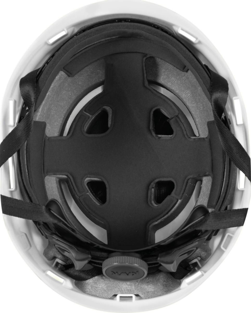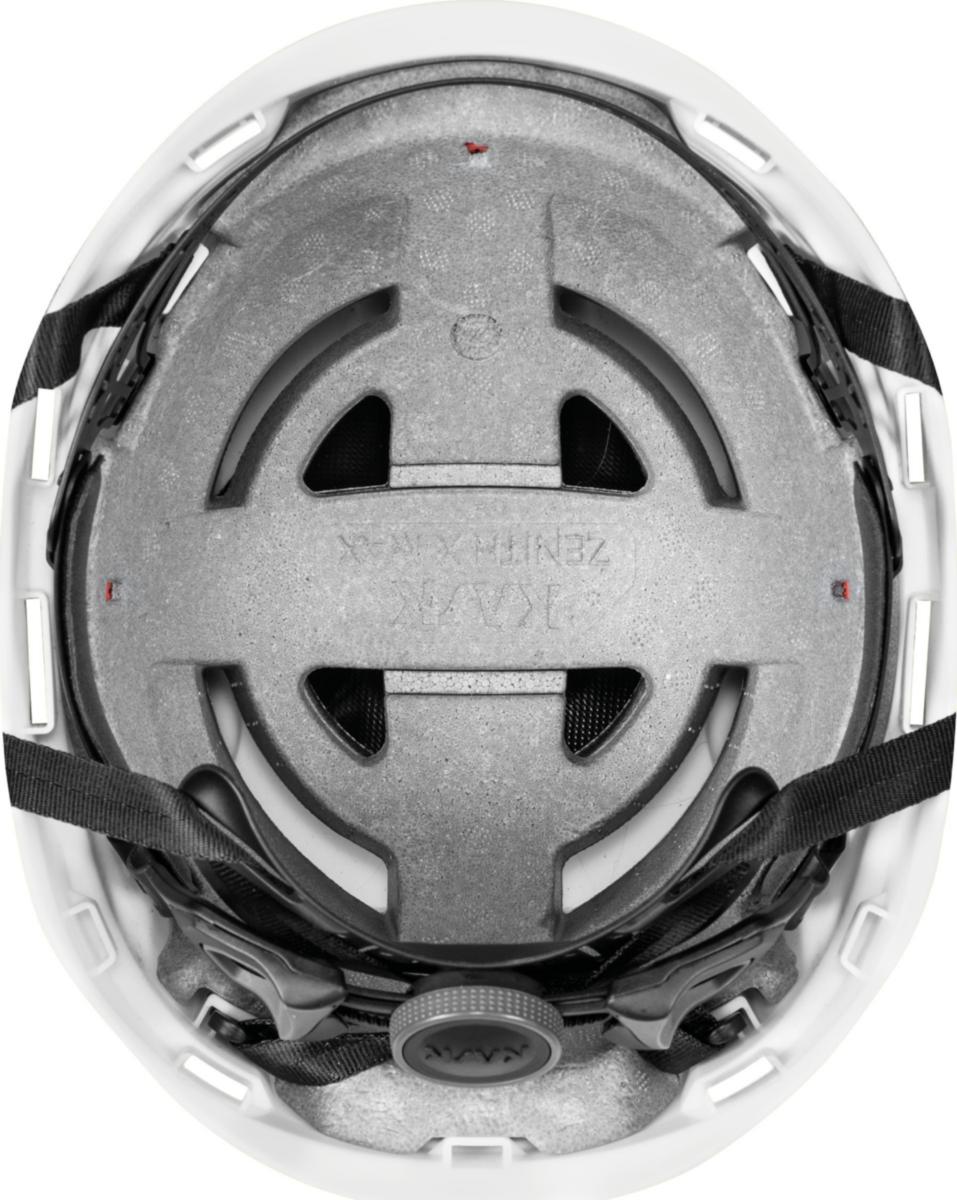 ZENITH X MAX från KASK är en skyddshjälm anpassad för huvudstorlekar mellan 62–66 cm. Hjälmen väger 570 g och har ett yttre skal i Polypropylen HD, vilket ger låg vikt och hög slagtålighet. Den är konstruerad för att klara temperaturer ner till -30°C och är avsedd för långvarig användning.