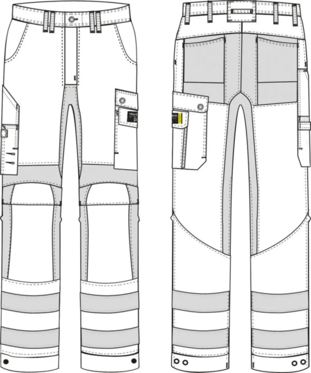Reinforced fly and stretch zones in crotch. Side pockets. Cargo pocket with flap and concealed D-ring, mobile phone pocket with flap. Ruler pocket with tool pocket. Shaped knees with kneepad pockets in HTPA Dobby and stretch zones. Back yoke in stretch and hip pockets. Back hem in HTPA. Adjustable foot width with plastic press studs. *Garments in colour 93 + EN ISO 20471 class 2 complies with RIS-3279-TOM. ¹This garment is produced with new PFAS-free fabrics. For a period, we will have a mixed stock and the transition to PFAS-free will be a running replacement.