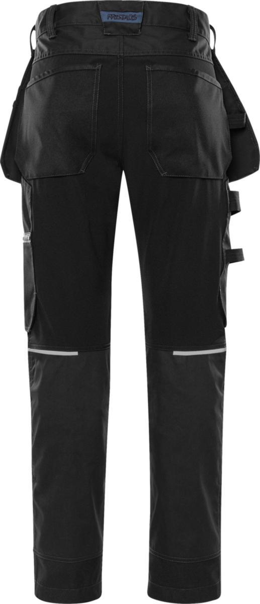 Delvis återvunnet material / Miljödeklarerad (EPD) / Mekanisk stretch / Stora partier med 4-vägsstretch bak och i grenen / 2 löst hängande spikfickor, helfodrade med extra slitstarkt material – den ena med 3 mindre fickor och verktygshällor, den andra med 2 fickor varav en med dragkedja / 2 framfickor / 2 bakfickor av extra slitstarkt material / Extra hällor för t ex id-kort vid linningen / Dubbel förstärkt grensöm / Hammarhank / Tumstocksficka av extra slitstarkt material med pennficka samt knapp och hälla för kniv / Rymlig benficka av extra slitstarkt material som även kan användas för tumstock, extra ficka med dragkedja / Knäfickor i CORDURA® med öppning utifrån, uppifrån / Knäskydden i knäfickorna kan höjdjusteras / Baksida av benslut förstärkta med extra slitstarkt material / Extra benupplägg, kan förlängas 5 cm / Reflexdetaljer på bakbenen / Godkänd enligt EN 14404 tillsammans med knäskydd 124292 / OEKO-TEX®-certifierad / EPD reg.nr 13198 på environdec.com. Material: Huvudmaterial 65% återvunnen polyester, 35% bomull, twill med mekanisk stretch. 4-vägsstretch 92% återvunnen polyester, 8% elastan. Övrigt material 100% återvunnen polyester. Huvudmaterial 250 g/m². Stretch 220 g/m². Övrigt material 230 g/m². PFAS-fri
