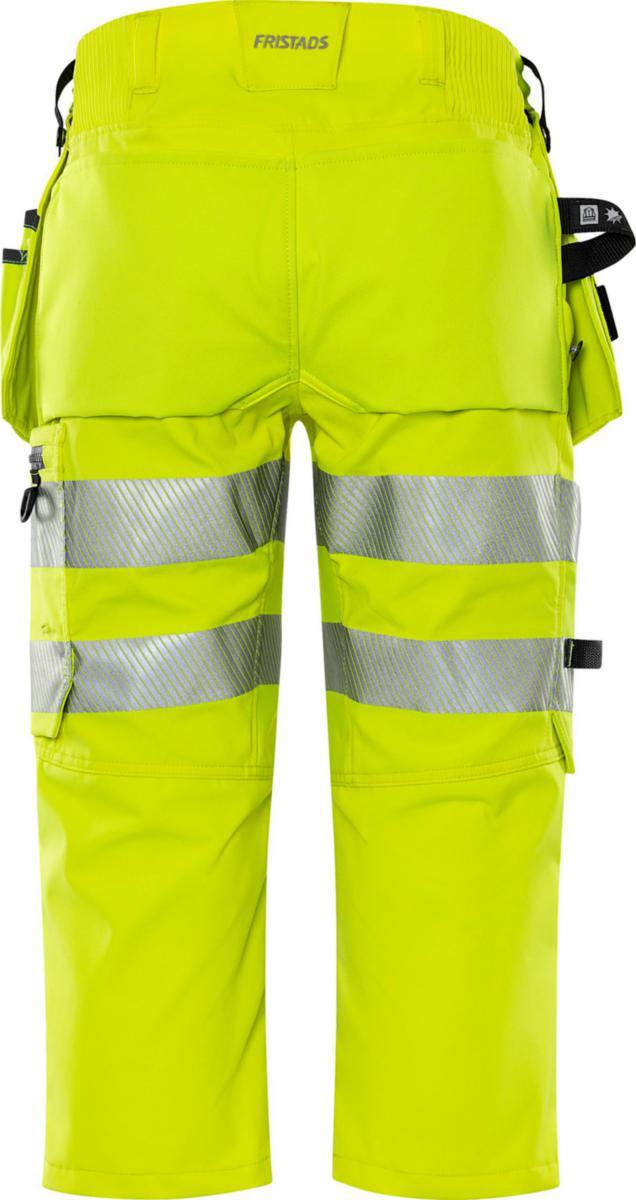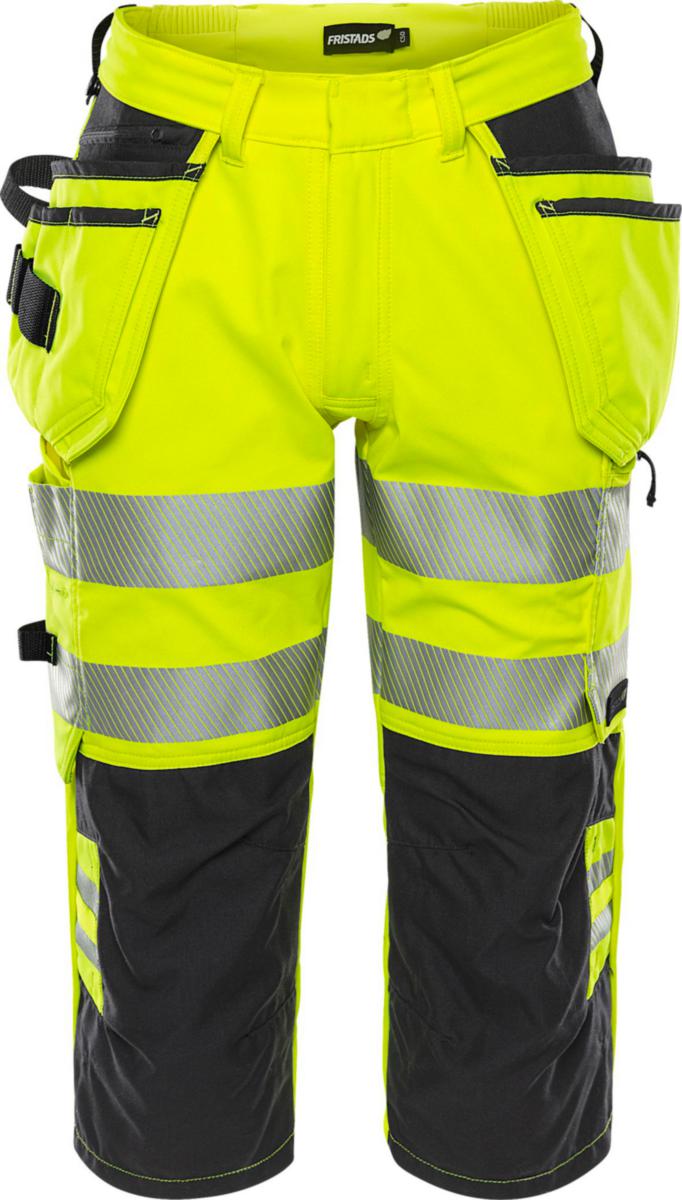Piratbyxor i 4-vägsstretch med avtagbara spikfickor. Varselbyxor av delvis biobaserat och återvunnet material med stretchpaneler i midjan för extra hög komfort. Koncept: Stiby.Delvis återvunnet och biobaserad material / 4-vägsstretch / Ribbstickade stretchpartier i midjan / Dold knapp fram / 2 löst hängande CORDURA®-förstärkta spikfickor – den ena med ficka med dragkedja, 3 mindre fickor och verktygshällor, den andra med extra ficka / Spikfickorna är avtagbara med dold dragkedja / D-ring under spikfickan / 2 framfickor / 2 rymliga bakfickor / Dubbel förstärkt grensöm / Hammarhank / CORDURA®-förstärkt tumstocksficka med verktygsficka, pennficka samt knapp och hälla för kniv / Benficka med tryckknapp, ficka med dragkedja och D-ring / Knäfickor i CORDURA® med öppning inifrån / Knäskydden i knäfickorna kan höjdjusteras / Godkänd enligt EN ISO 20471 klass 1 för C44-C46 och klass 2 för C48-C62 , EN 14404 tillsammans med knäskydd 124292 och EN 13758-2 UPF 40+ UV-skydd / Godkänd efter 50 tvättar / OEKO-TEX®-certifierad. Material: 4-vägsstretch 44% PTT (delvis biobaserat material), 44% polyester, 12% återvunnen polyester. 260 g/m². Tvättråd: 60°C. Standard: EN ISO 20471 – Varsel, hög synbarhet, EN 14404 – Knäskydd. PFAS-fri