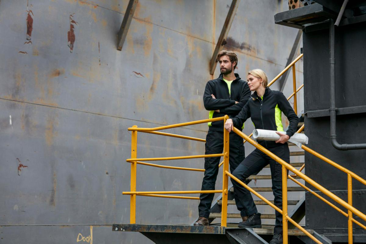 Collegejacka med borstad insida och avvikande paneler i sidan. Två rymliga frontfickor med dragkedja. Elastisk mudd i nederkant och vid ärmslut. Två färgalternativ med förhöjd synbarhet finns. Material: 80% bomull, 20% polyester, 315 g/m². Tvättråd: 60°.