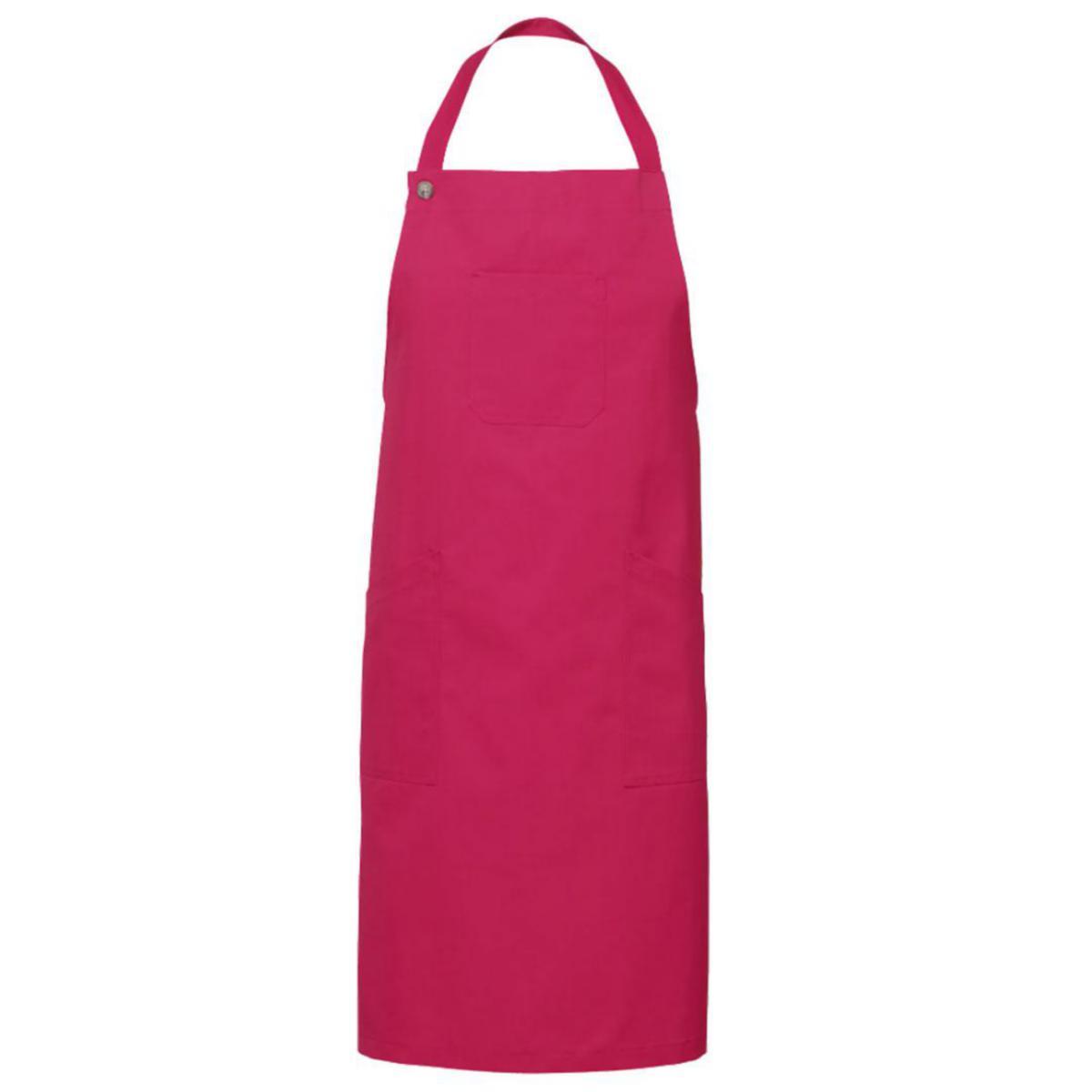 Rakt förkläde med sydda band. Reglerbart nackband med tre knappar. Två sidfickor och en bröstficka. Storlek Bredd 71 cm Längd 88 cm. Material 65% polyester 35% bomull. 210 g/m2.