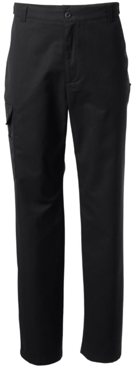 Byxa med hel linning. Justering av midjevidd med knapp och tamp. Hällor. Gylf. Sidfickor. Bakfickor. Benficka med lock som stängs med knappar samt telefonficka och extraficka. Innerbenslängd storlek M: 83 cm. Oeko-Tex®. Material: 65% polyester 35% bomull. 210 g/m².