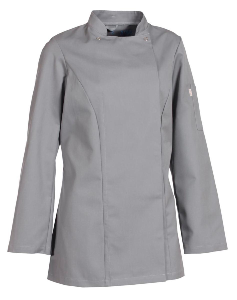 Figursydd långärmad damkockjacka med specialutvecklad passform för ökad komfort. Långa ärmar och pennficka på vänster ärm. Nackstropp till bröstlappsförkläden. Kvaliteten är slitstark och smutsavvisande
