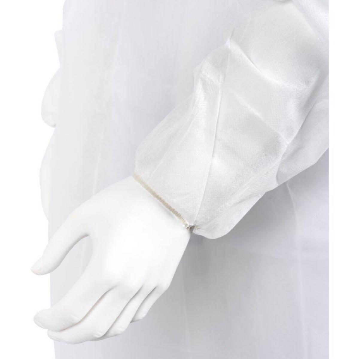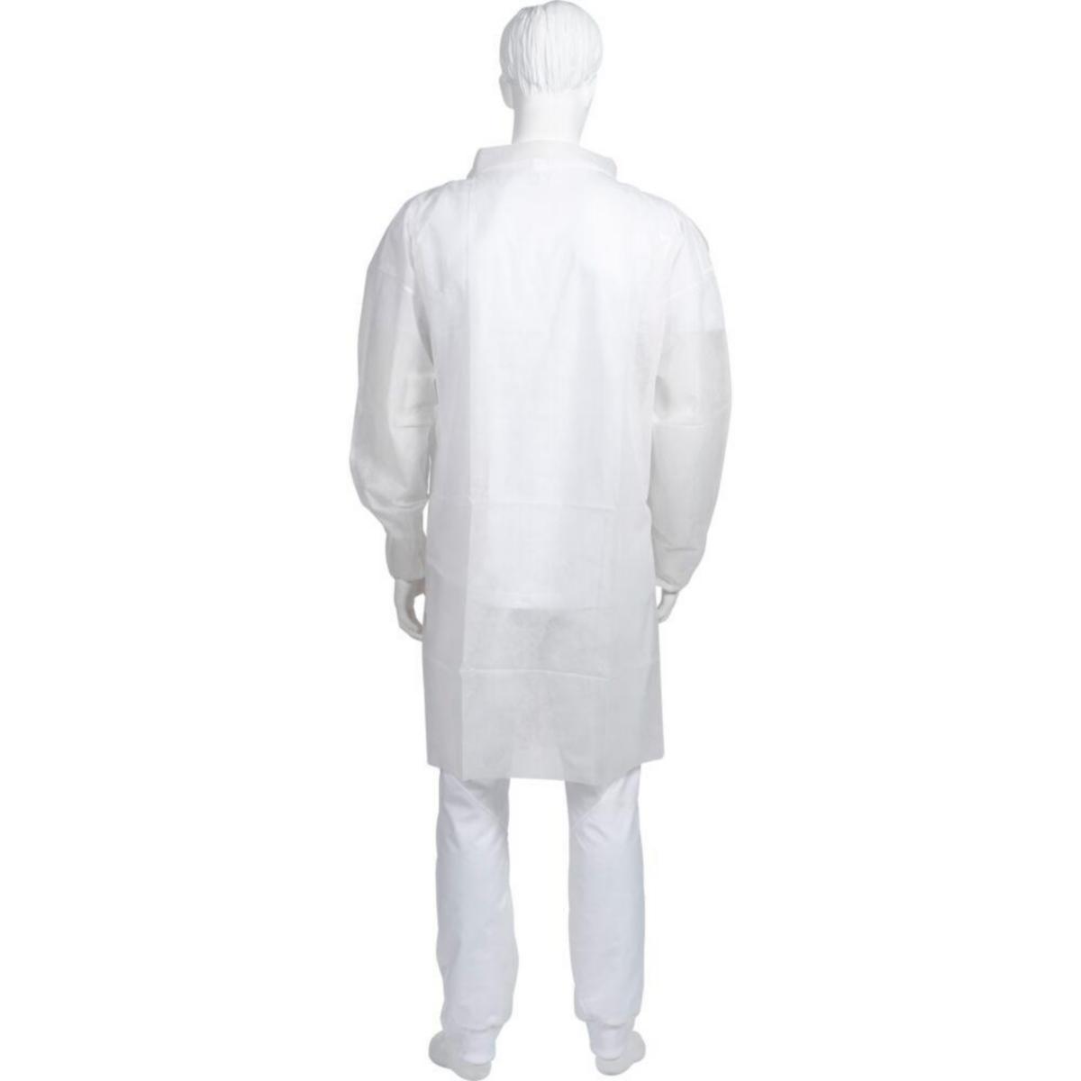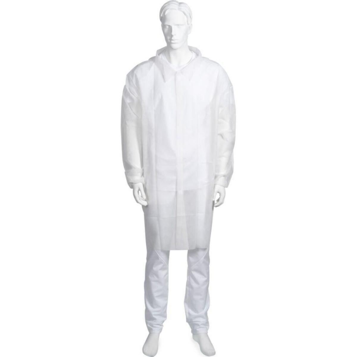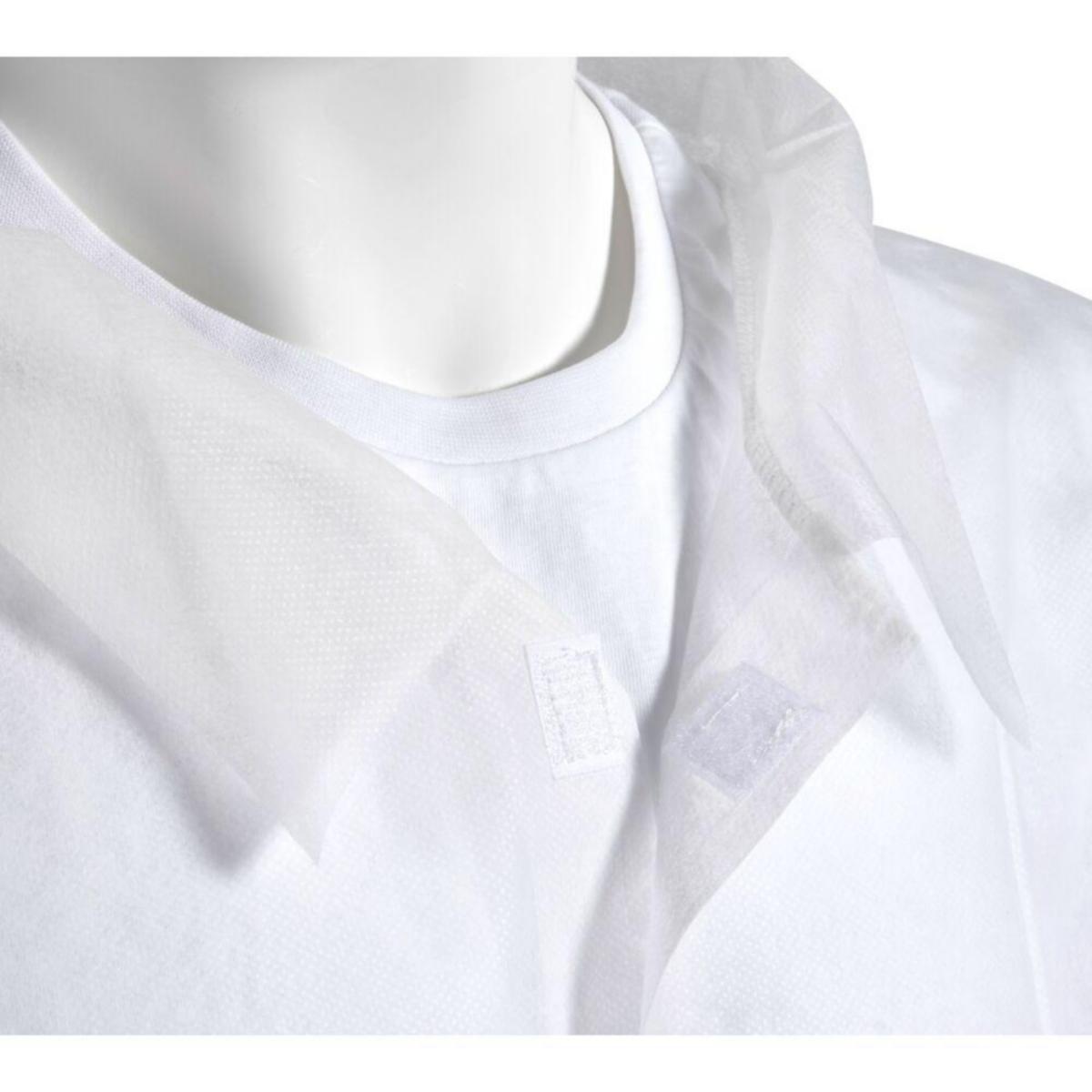 Långärmad besöksjacka med elastisk i ärmsluten och kardborrestängning. Kardborrbanden är lätta att öppna och stänga igen. Används för att skydda användaren och miljöer där höga hygieniska standarder krävs. Material: PP.
