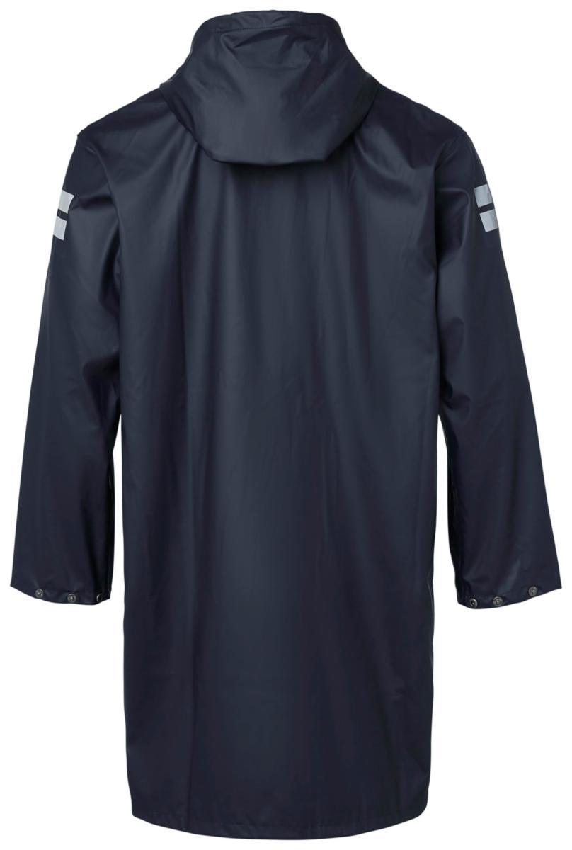 Regnrock i smidigt stretchmaterial. Blixtlås med slå och tryckknappar. Huva med snodd. Svetsade sömmar. Reglerbart ärmslut. Material: Polyuretanbelagt stretch. 10000 mm vattenpelare.