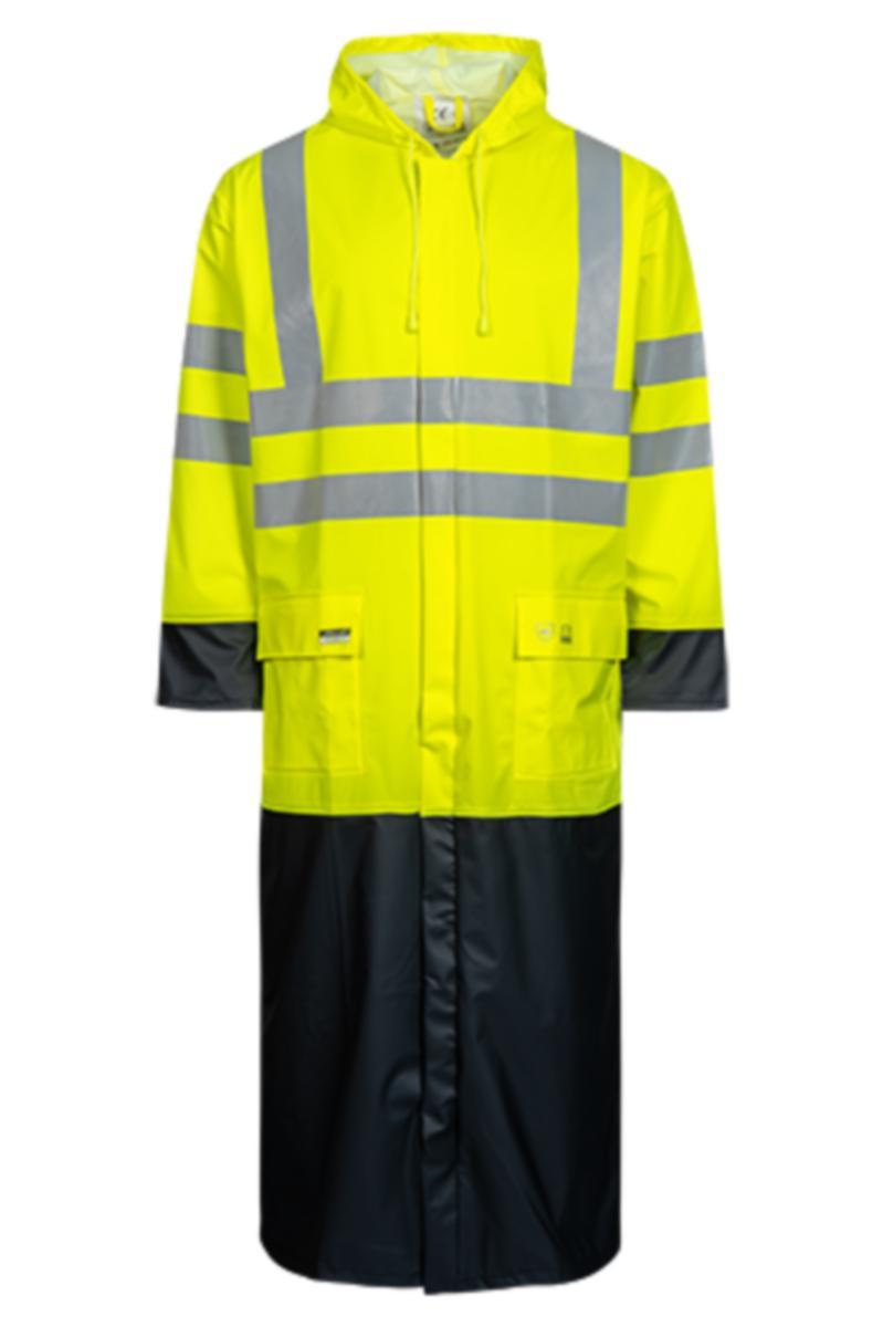 Hi-Viz regnjacka i PU-kvalitet, 135 cm. 50 % polyester, 50 % polyuretan, 190 g/m2. Vindtät och vattentät. Vattentäthet: 11 000 mm. Fast huva med dragsko. Dold dragkedja från midjan och uppåt. Justering med tryckknappar vid ärmsluten. Jackan har en droppkant i nederkanten. Två ytterfickor.