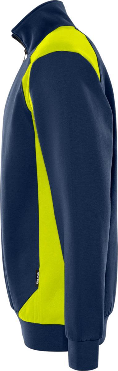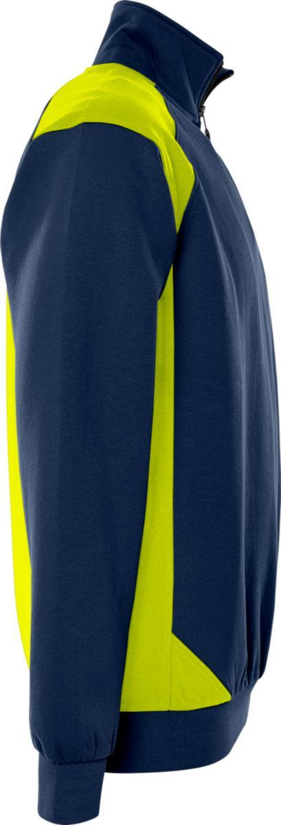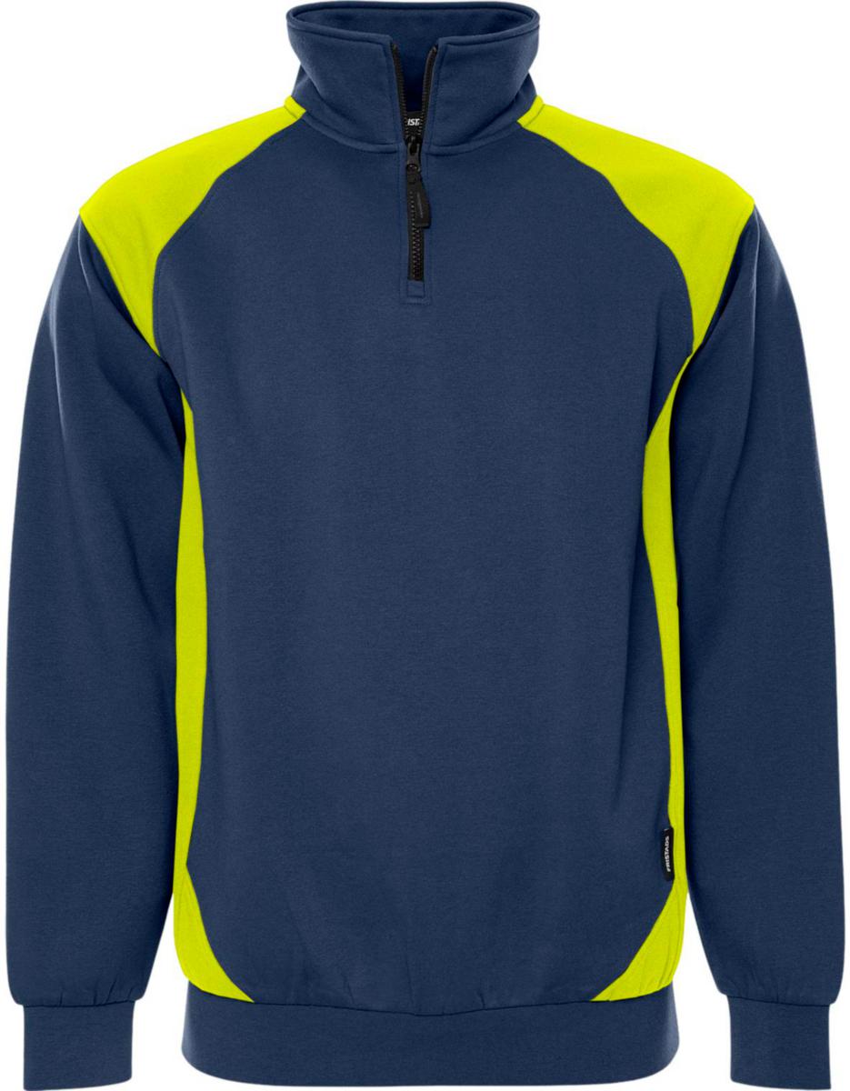 Tvåfärgad sweatshirt av återvunnen polyester och bomull. En slitstark och bekväm tröja med kort dragkedja och borstad insida. Godkänd för industritvätt. Material: 65% återvunnen polyester och 35% bomull (Varselgul av 80% återvunnen polyester, 20% bomull).