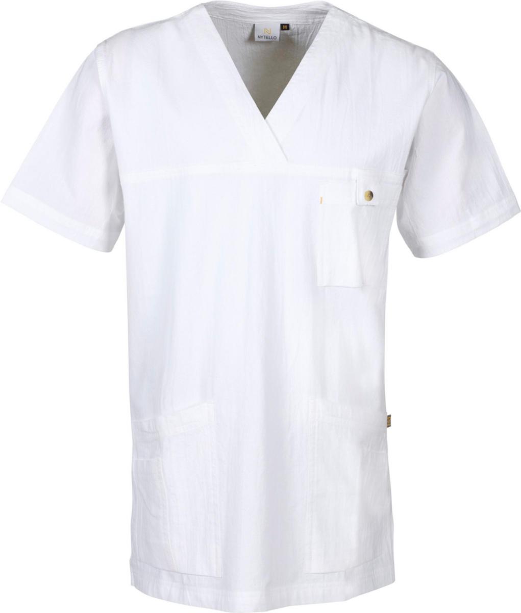 Rak modell med V-ringning och kort ärm. Sidfickor med bälg, telefonficka och extraficka. Bröstficka med bälg, knapp och tamp. Slits i sidor. Längd mitt bak storlek M: 77cm. Bomull.
