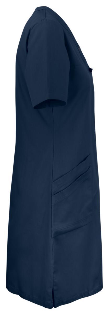 Lätt insvängd klänning med V-ringning. Modellen har dubbla snedställda fickor fram varav en med nyckel/korthållare, samt bröstficka. Ringknapp i V-ringningen. Rygglängd 100 cm i storlek M. Material: 50% Bomull, 50% Polyester, 180 g/m². Tvättråd: 85°.