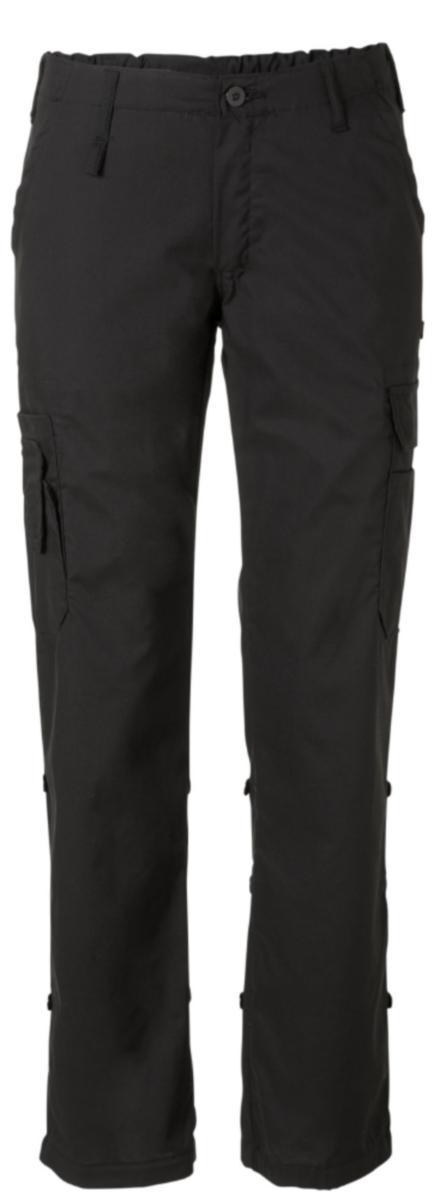 Bekväm dambyxa med resår bak som ger en följsam och lätt passform. Byxan är enkel att ta på tack vare resår och gylf i midjan. Benlängden kan justeras i tre nivåer med tamp och knapp, och benvidden går också att anpassa med resår och knapp för extra flexibilitet. Den är utrustad med praktiska detaljer som hällor, sidfickor och rymliga benfickor med bälg. Den högra benfickan har fack för penna och telefon och stängs med slejf och kardborre, medan den vänstra har lock och ett extrafack med pennhållare. Material: 50/50% bomull/polyester.