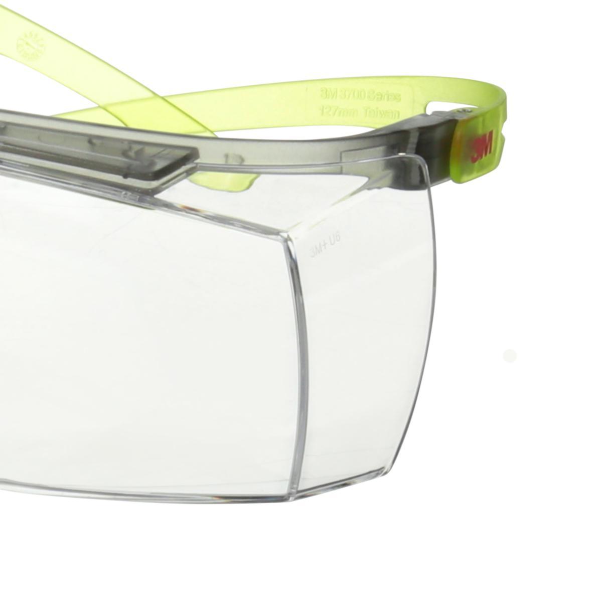 3M SecureFit 3700 är skyddsglasögon som bärs över vanliga glasögon, med en blå skalm, klar lins, överliggare och anti-fog skydd. Detta ger ett exceptionellt bra skydd mot imma och repor på linsen i tuffa arbetsförhållanden. Pantoskopiska skalmar (justerbara i höjdled) ger användare möjlighet att ställa in glasögonen för en individuell passform. Flera olika skalm- och linsfärger finns tillgängliga.