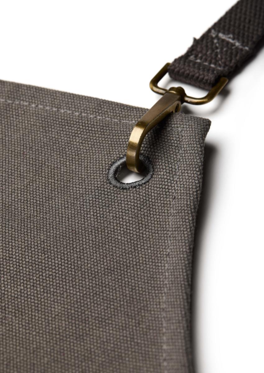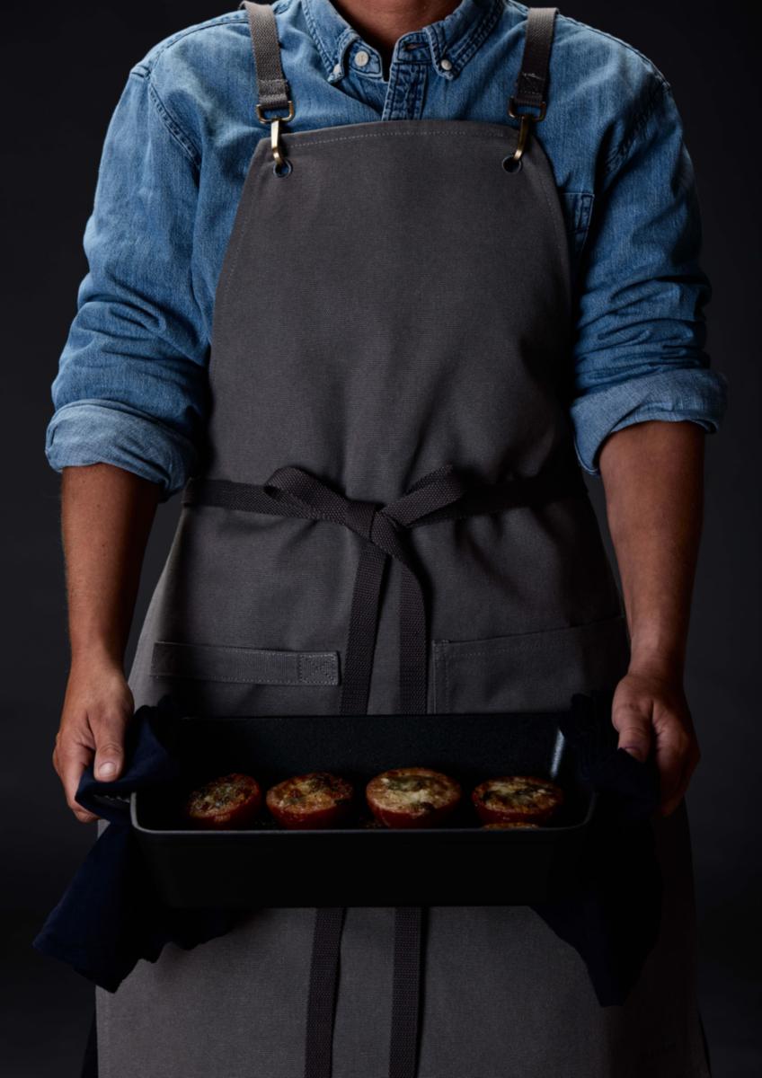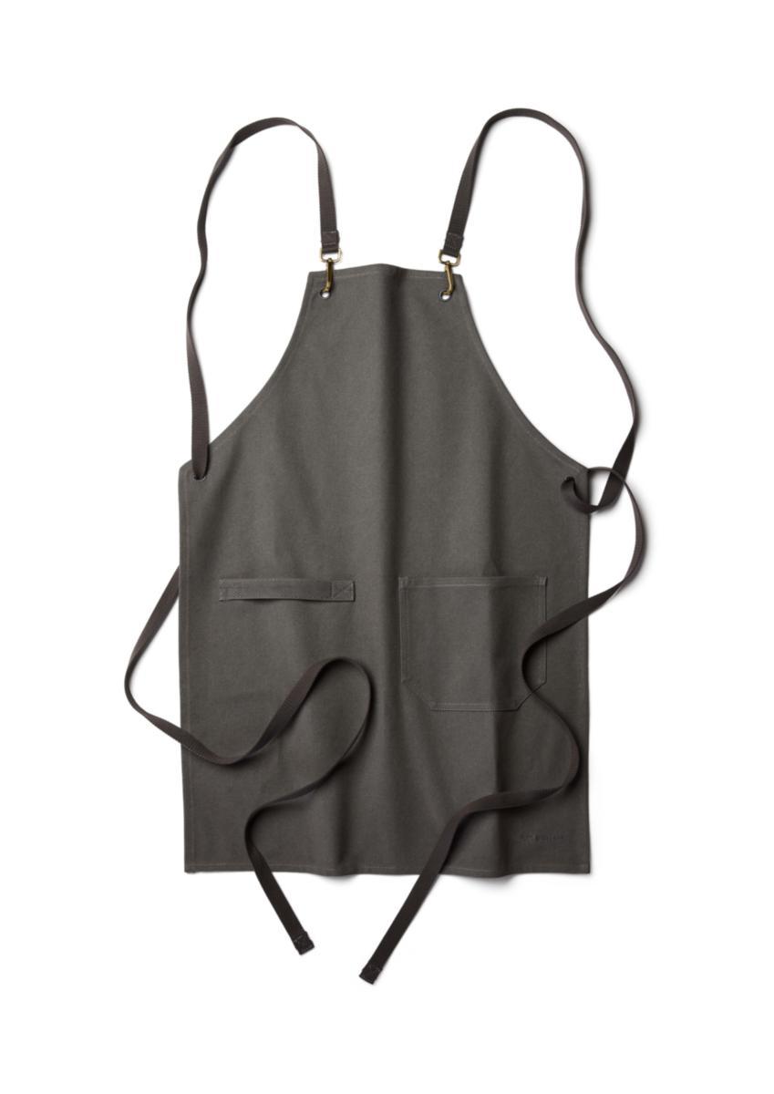 Förkläde i bomullscanvas - Praktiskt och elegant. Följbart material för bekväm passform. Rymlig frontficka för förvaring och praktisk öglaför att hålla kökshandduk eller redskap på plats. Korslagda band i ryggen som knyts runt midjan för högre komfort.