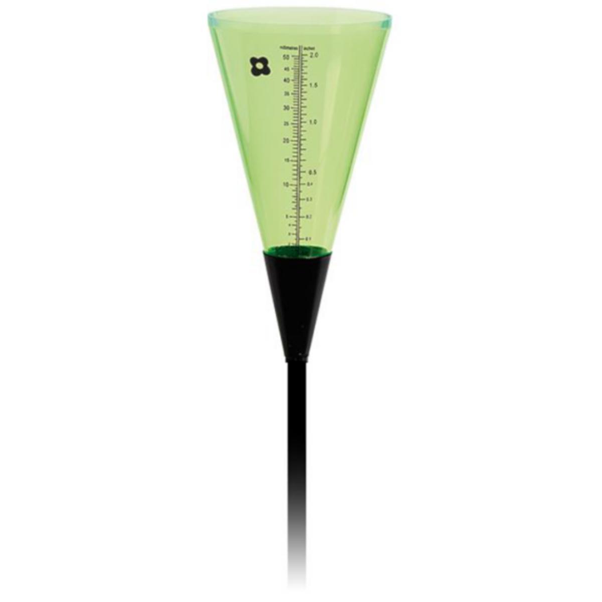 Dekorativ regnmätare som mäter upp till 50 mm. Levereras med ett svart fotstativ med en höjd på 80 cm.